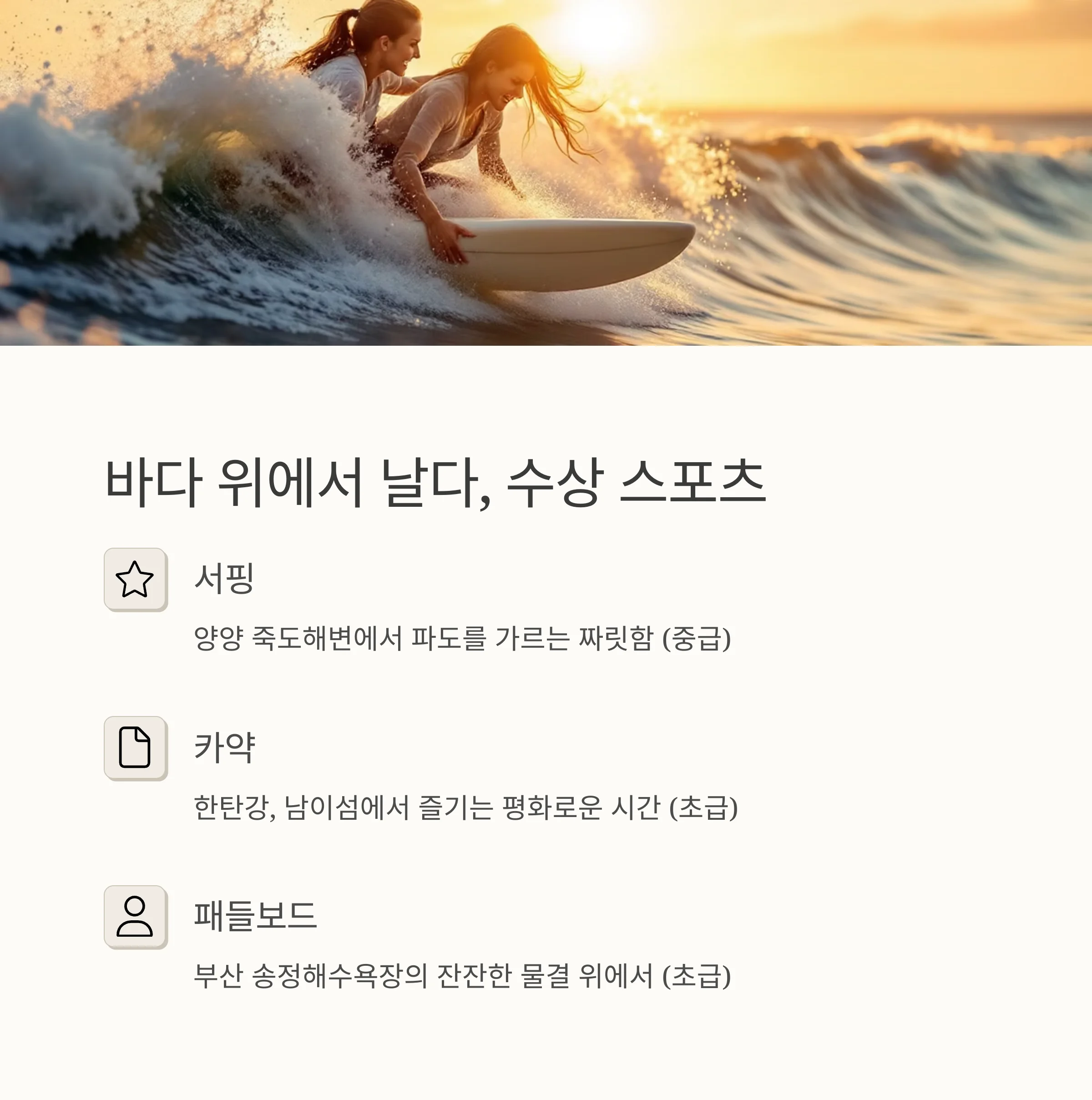| 서핑 | 양양 죽도해변 | 중급 |