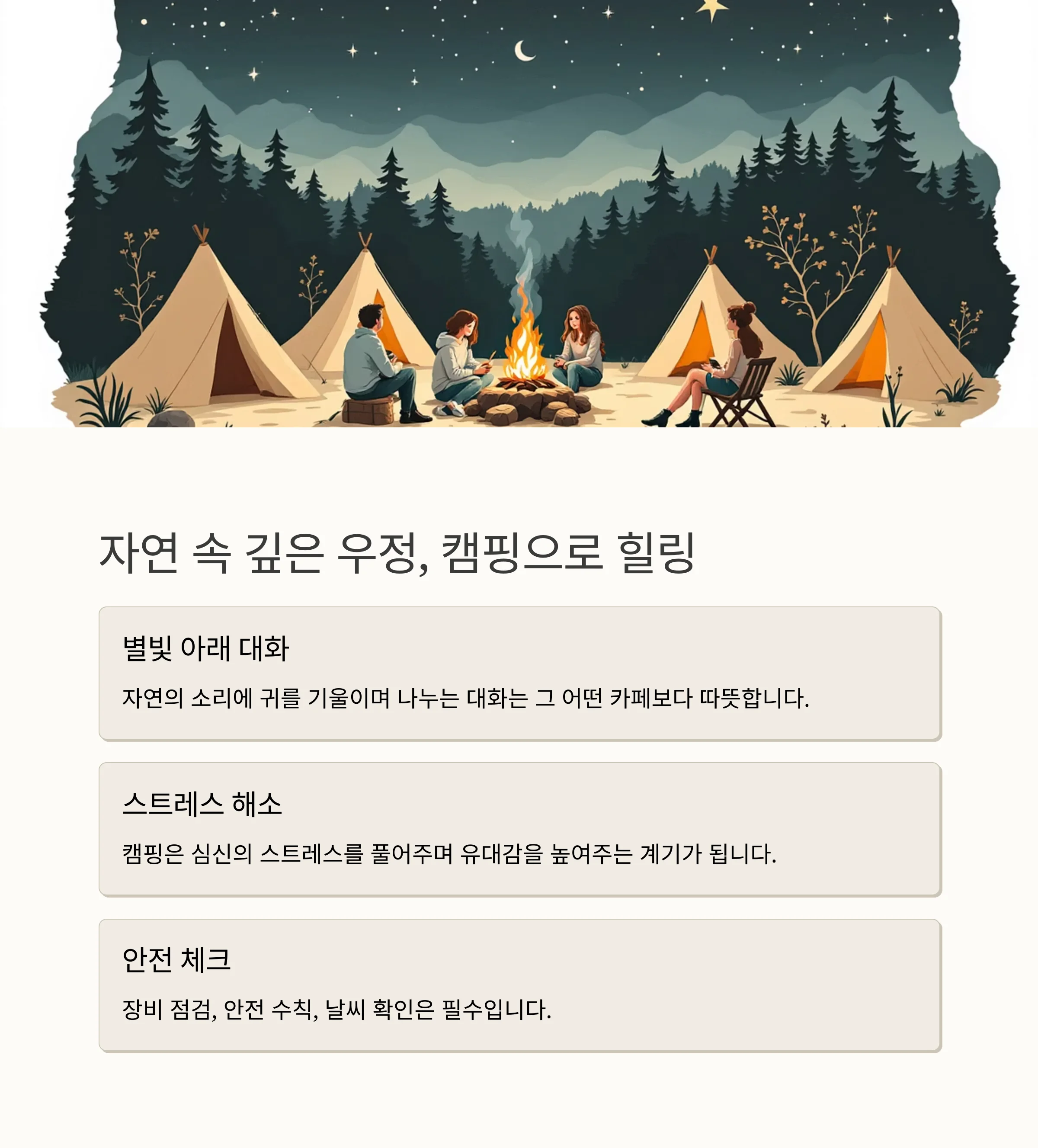 캠핑은 심신의 스트레스를 풀어주며 유대감을 높여주는 중요한 계기가 됩니다.