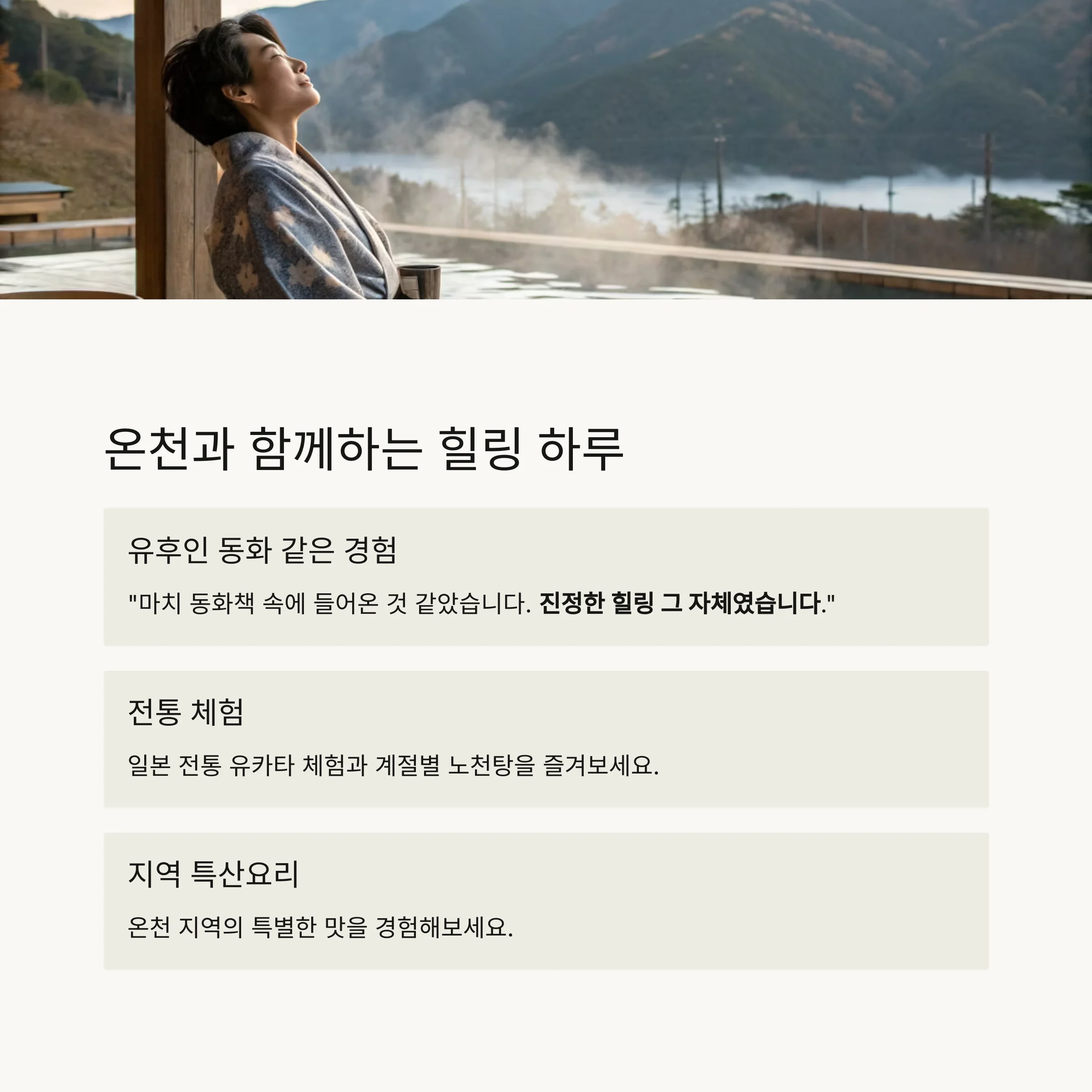 “유후인 온천에 도착하니 마치 동화책 속에 들어온 것 같았습니다. 온천욕 후, 마을 카페에서 여유롭게 차를 마시는 시간은 진정한 힐링 그 자체였습니다.”