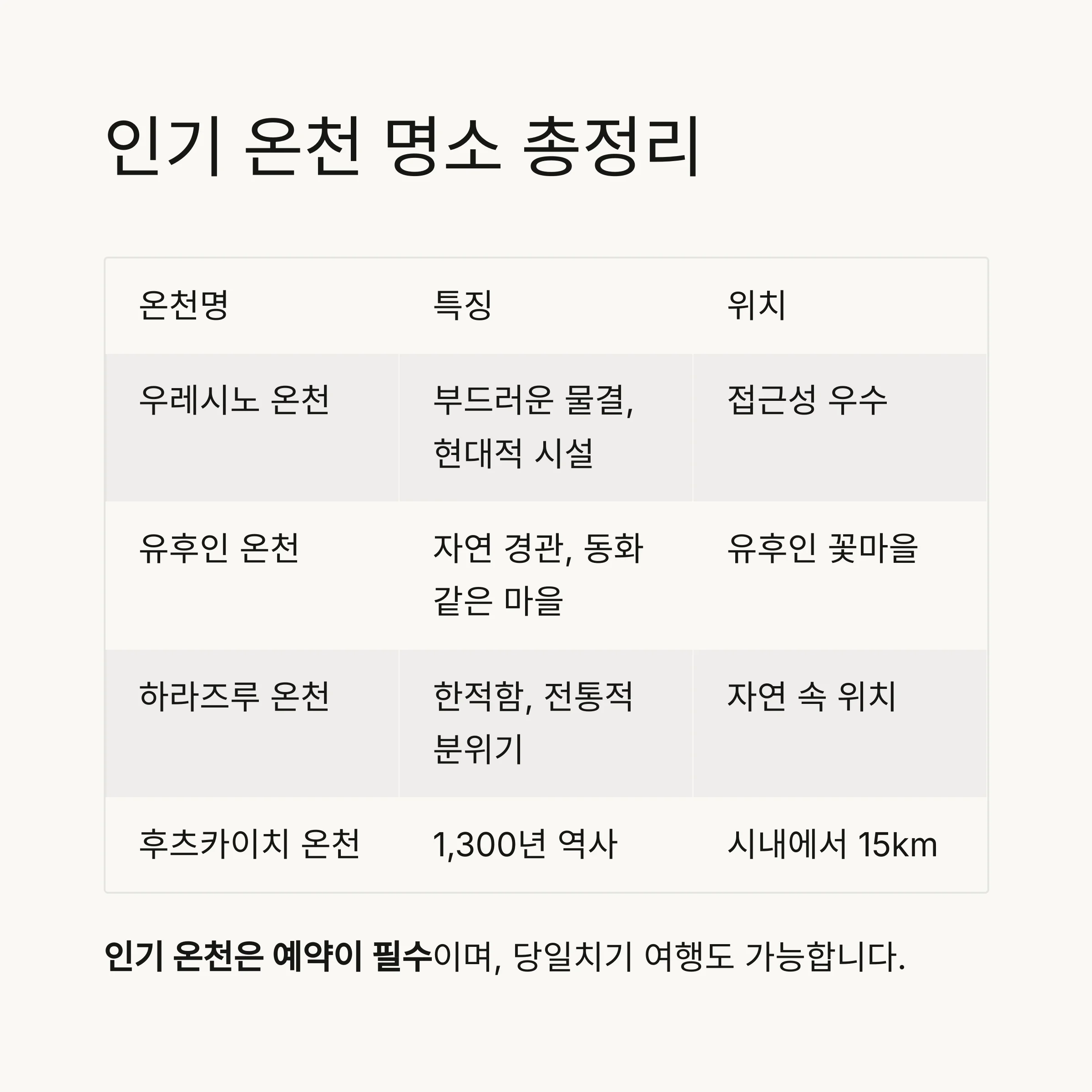 인기 온천은 예약이 필수이며, 도심과 가까워 당일치기 여행도 충분히 가능합니다.
