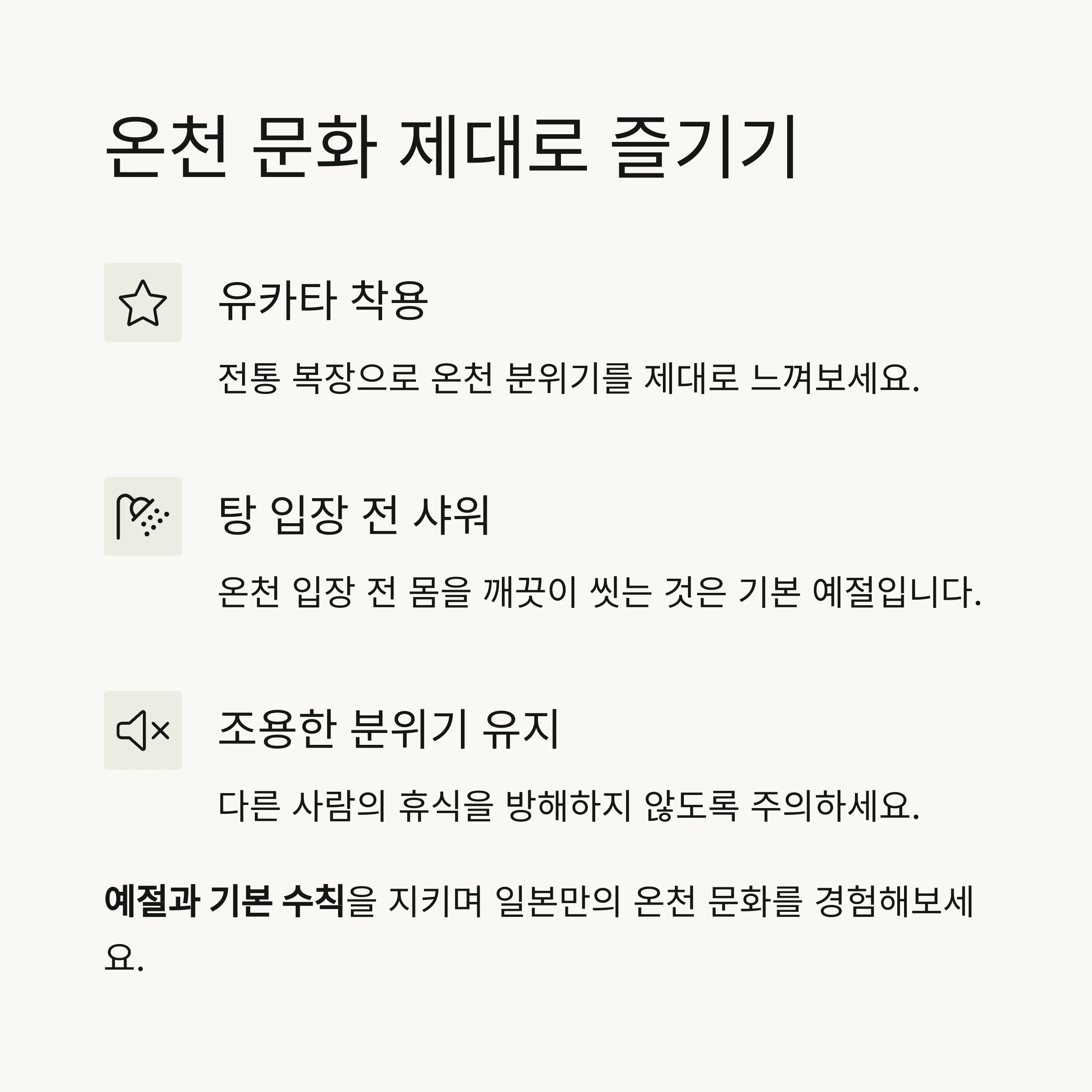 온천 방문 시에는 일본 전통 유카타 체험, 계절별 노천탕 즐기기, 지역 특산요리 맛보기 등 다양한 문화 체험도 꼭 추천합니다.