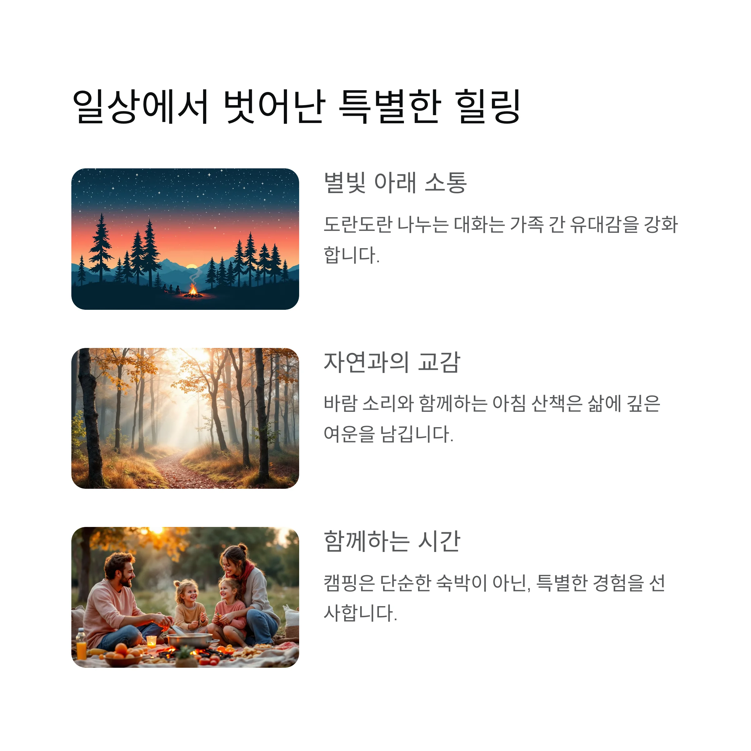 캠핑은 단순한 숙박이 아닌, 자연과 교감하고 가족과 소통하는 특별한 시간입니다.