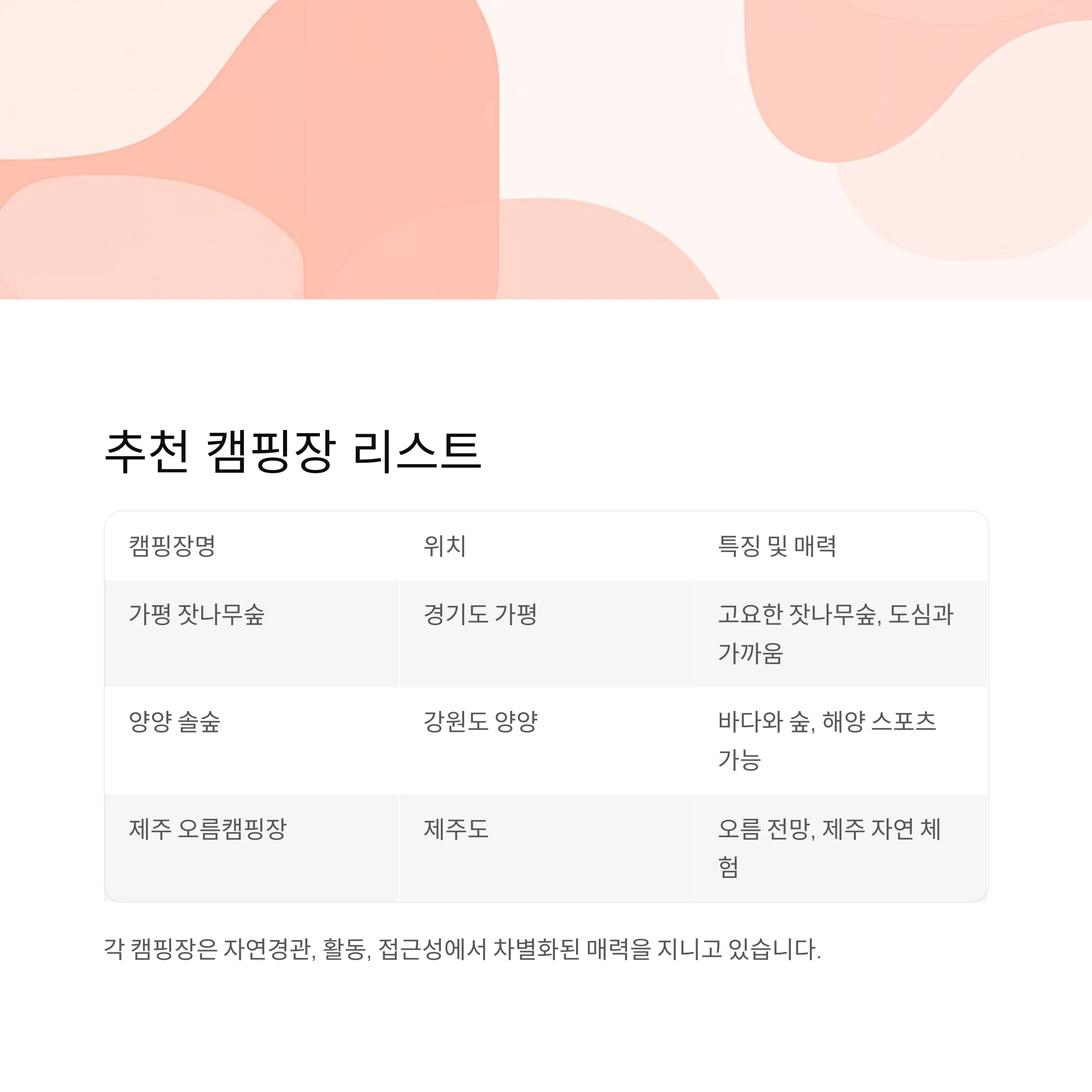 핵심: 각 캠핑장은 자연경관, 활동, 접근성에서 차별화된 매력을 지니고 있습니다.