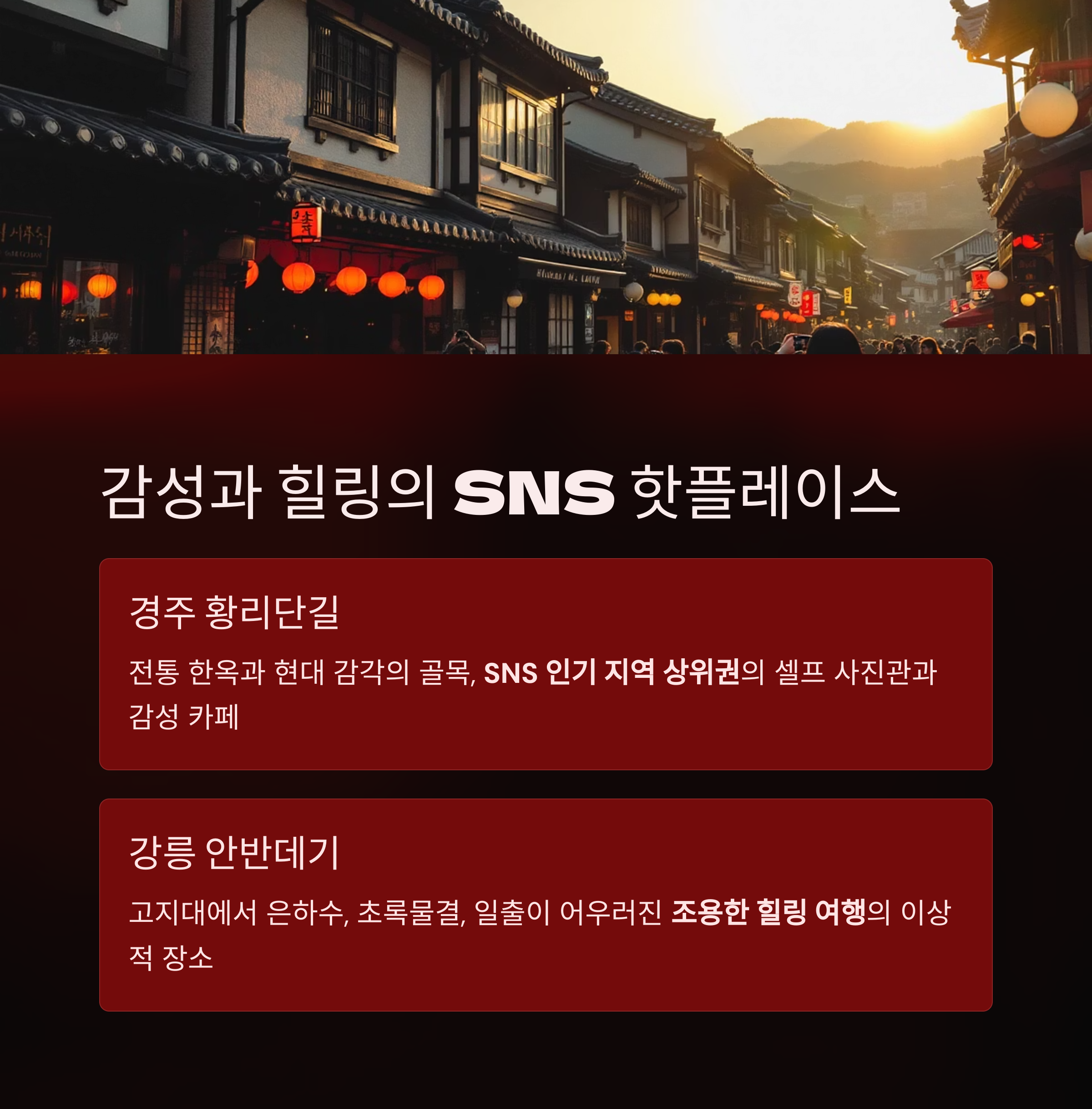 경주 황리단길은 전통 한옥과 현대 감각의 골목이 어우러지며, 셀프 사진관과 감성 카페로 SNS 인기 지역 상위권을 유지하고 있습니다.
