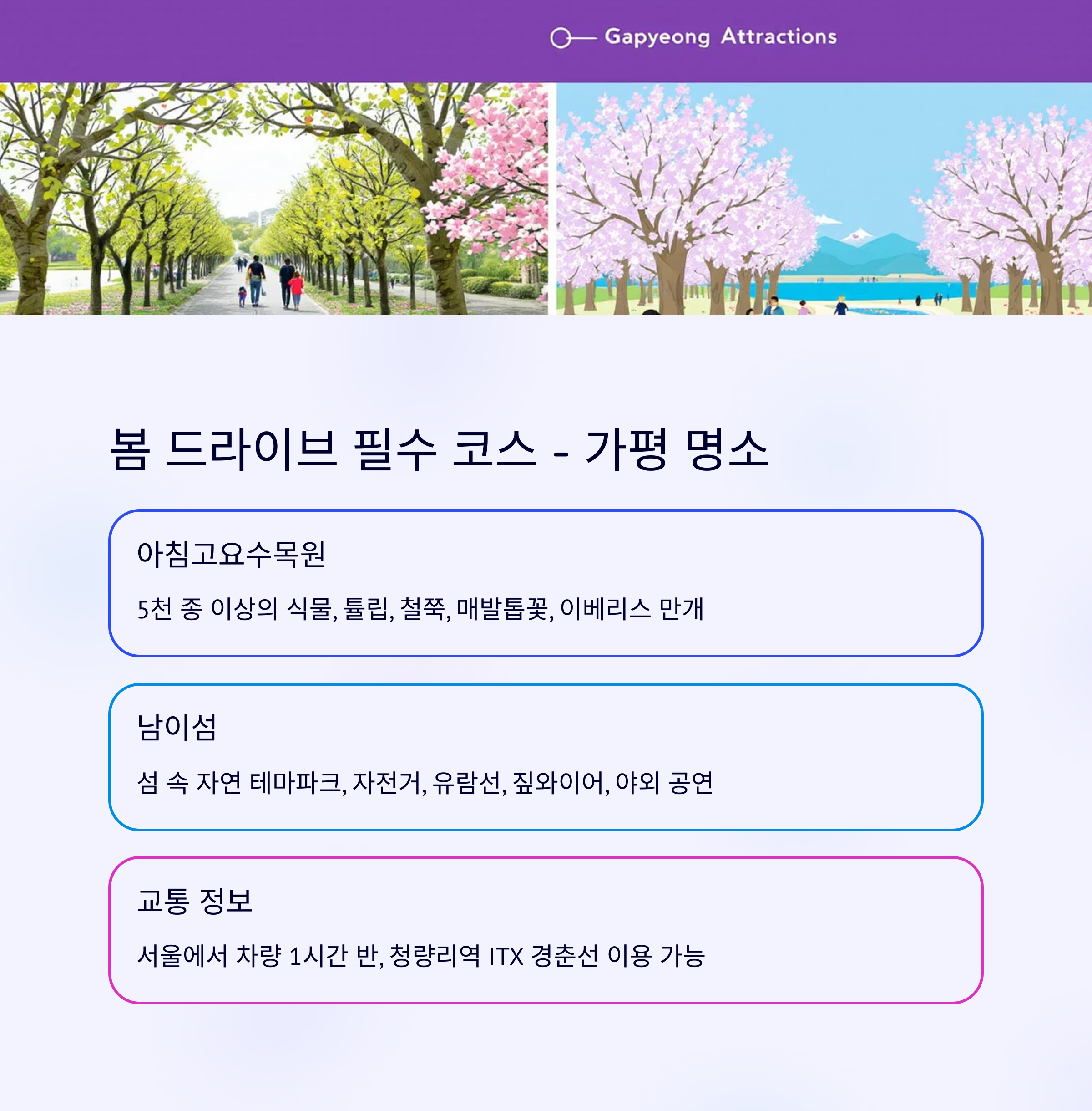 | 서울 전역 | 가평 아침고요/남이섬 | 꽃축제 + 액티비티 + 식물원 | 1시간 30분 |