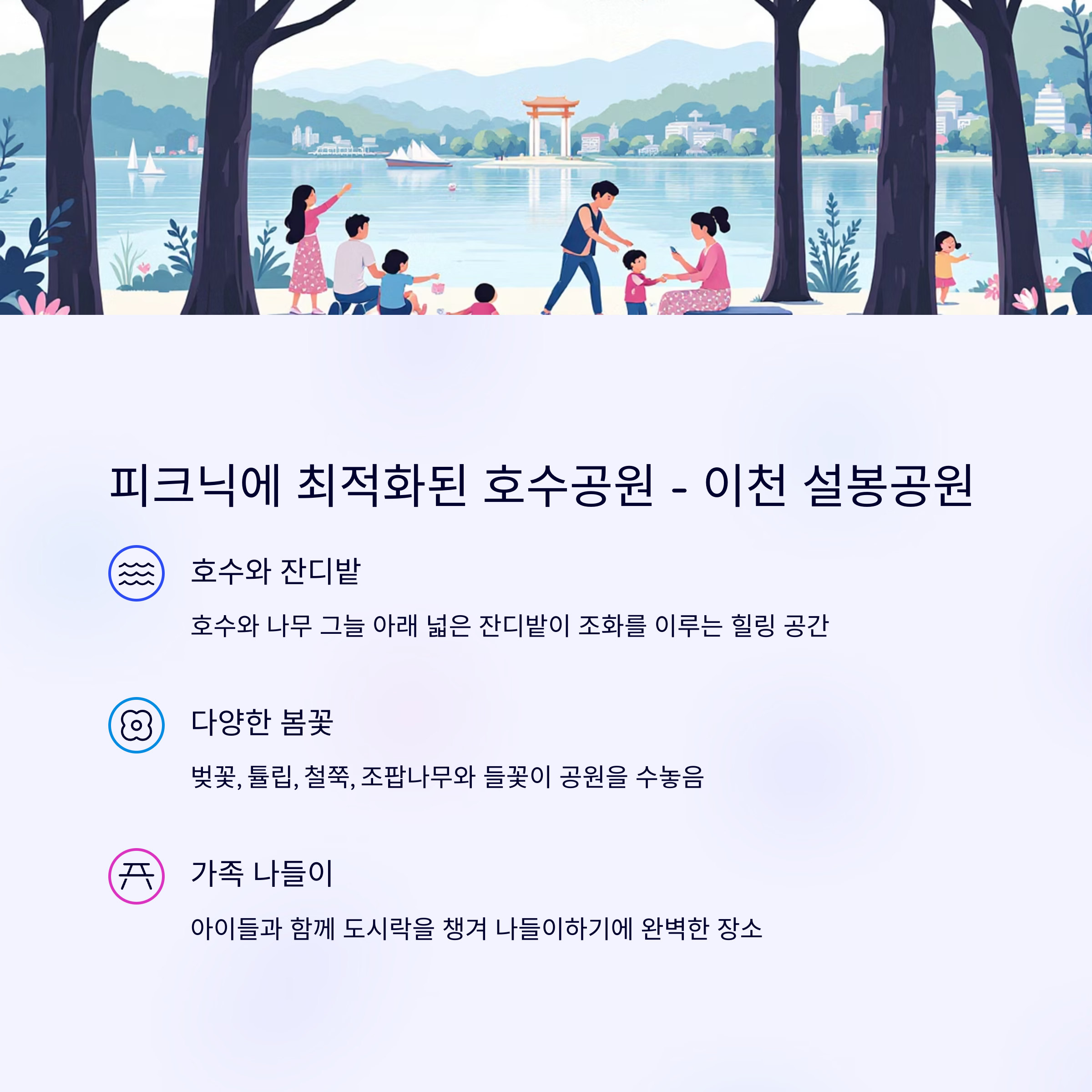 | 서울 강남 | 이천 설봉공원 | 호수, 산책로, 피크닉존 | 약 1시간 |