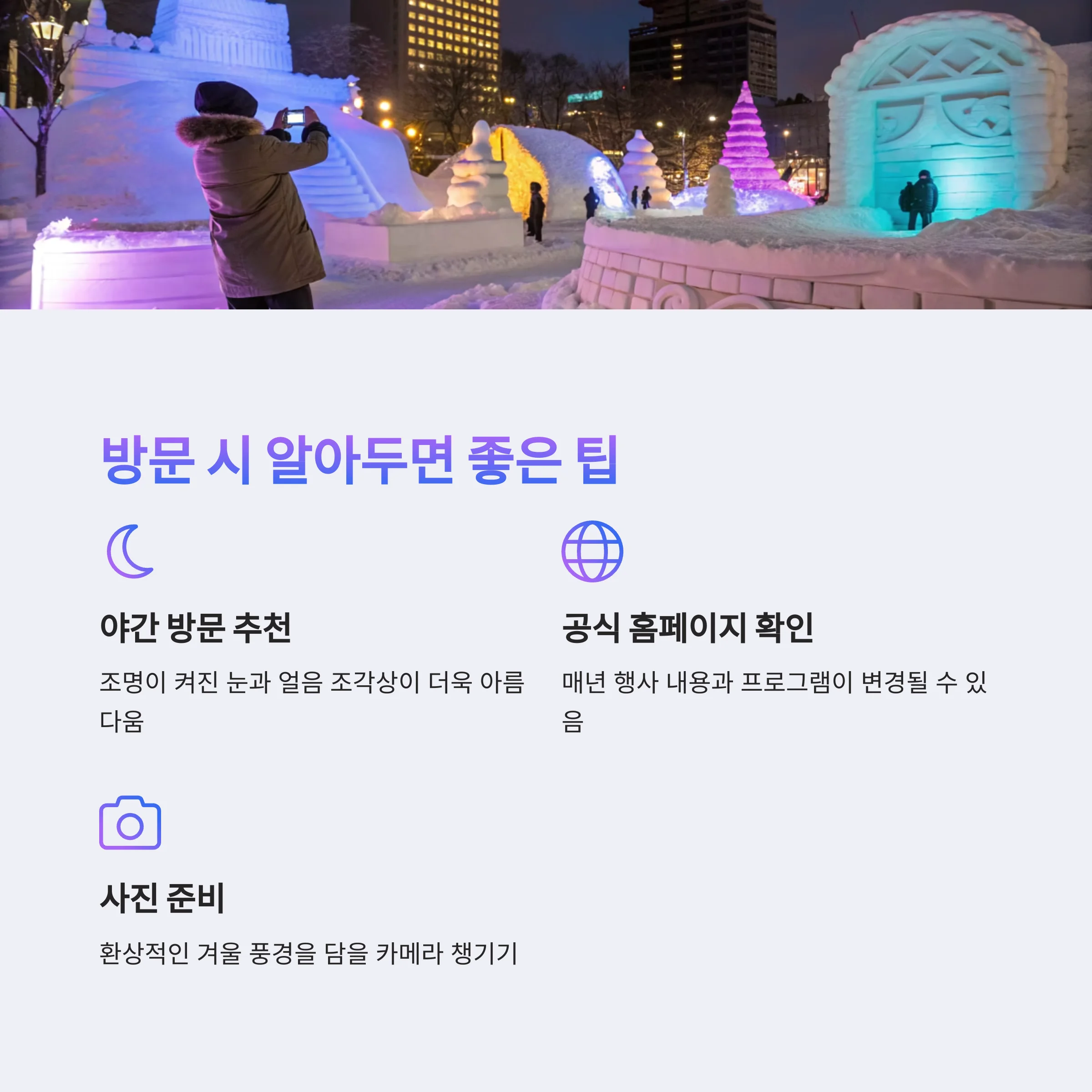 삿포로 눈축제와 더불어, 인근 온천 여행(조잔케이 등), 겨울 미식(게 요리, 라멘, 유빙 투어)도 꼭 추천합니다.