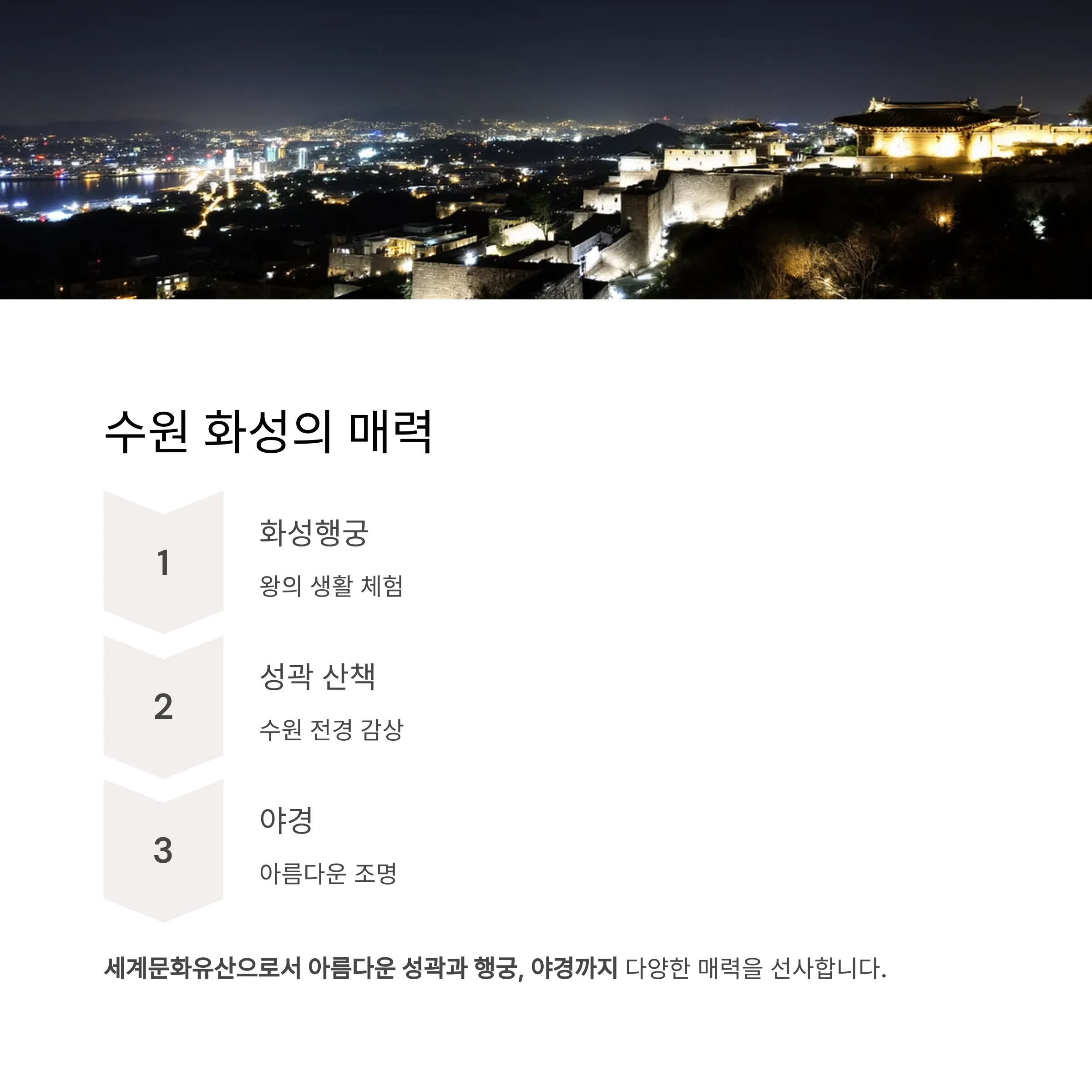 세계문화유산으로서 아름다운 성곽과 행궁, 야경까지 다양한 매력을 선사합니다.