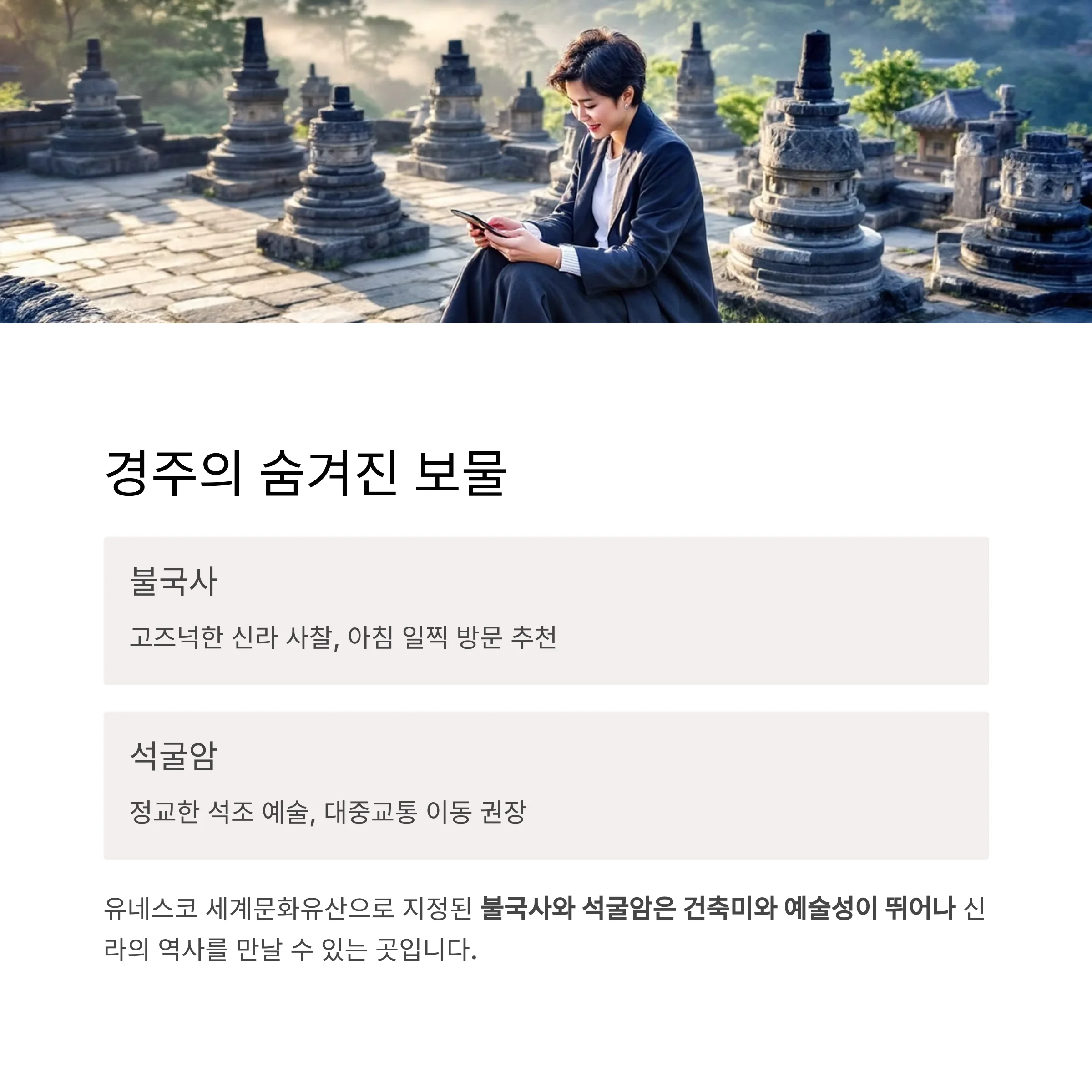 경주는 한국 전통과 역사의 정수를 느낄 수 있는 대표적인 도시입니다.