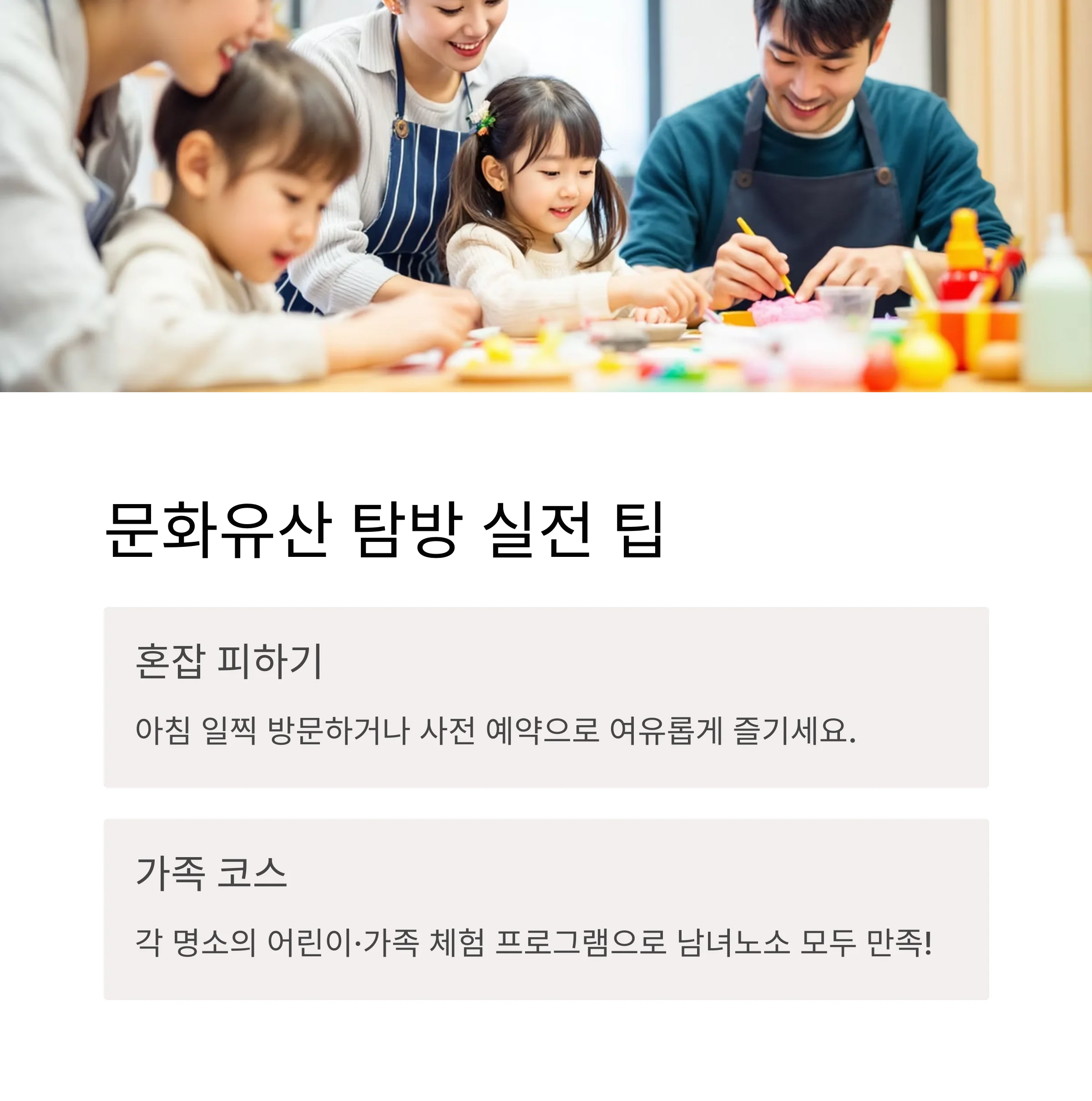 A. 각 명소마다 어린이·가족 체험 프로그램이 많아 남녀노소 모두 만족할 수 있습니다.