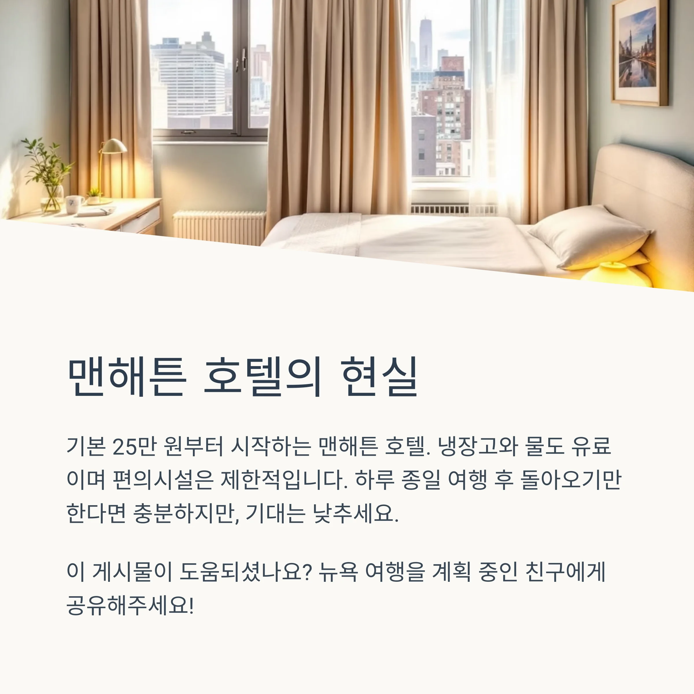 맨해튼의 호텔은 기본이 25만 원, 가성비를 찾으려면 외곽으로 나가야 합니다. 방 상태는 깔끔하지만 냉장고와 물도 유료, 편의시설은 제한적이었습니다. 하루 14시간 여행을 마치고 돌아오기엔 충분하지만, 기대는 낮추는 것이 좋습니다.