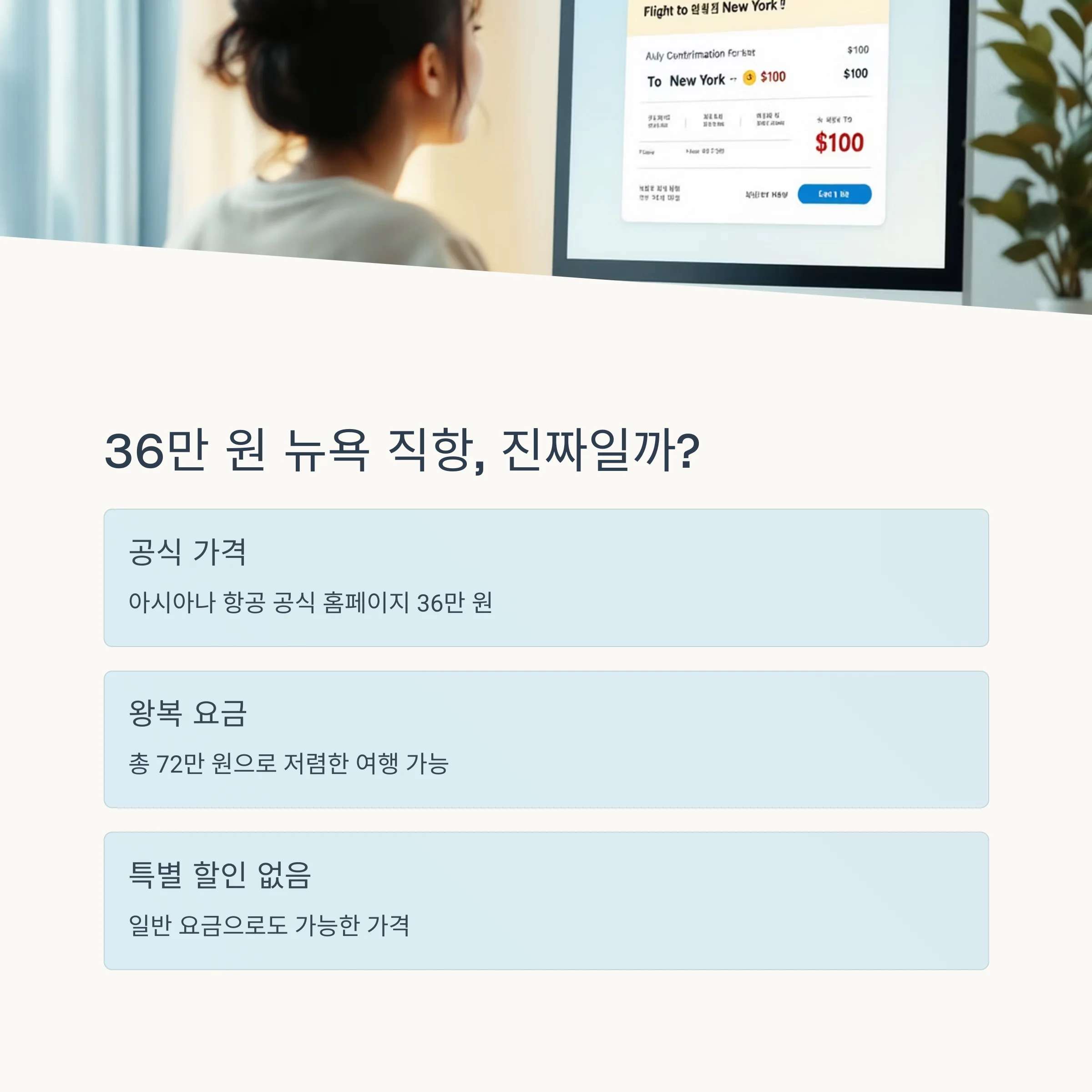 항공권 가격이 보통 100만 원 이상이라는 인식이 있는 미국행. 하지만 최근 공식 항공사 홈페이지에서 뉴욕 직항이 36만 원에 등장했습니다. 왕복하면 72만 원으로, 저가 항공도 아닌 아시아나 항공의 공식 가격이라 더욱 충격적이었습니다. 할인 팁 없이도 이 가격이 가능하다는 점이 핵심이죠.