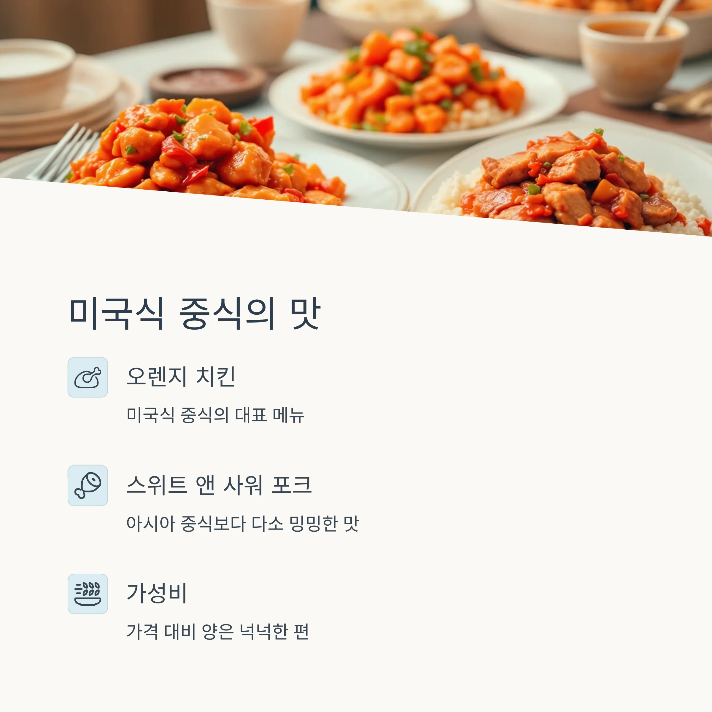 차이나타운에서 먹은 오렌지 치킨, 스위트 앤 사워 포크 같은 메뉴는 미국식 중식의 대표 메뉴입니다. 맛은 괜찮지만 아시아권에서 먹는 중식보다는 다소 밍밍하다는 평이었고, 가격 대비 양은 넉넉했습니다. 기대만큼은 아니지만 궁금증은 해소된 셈이죠.