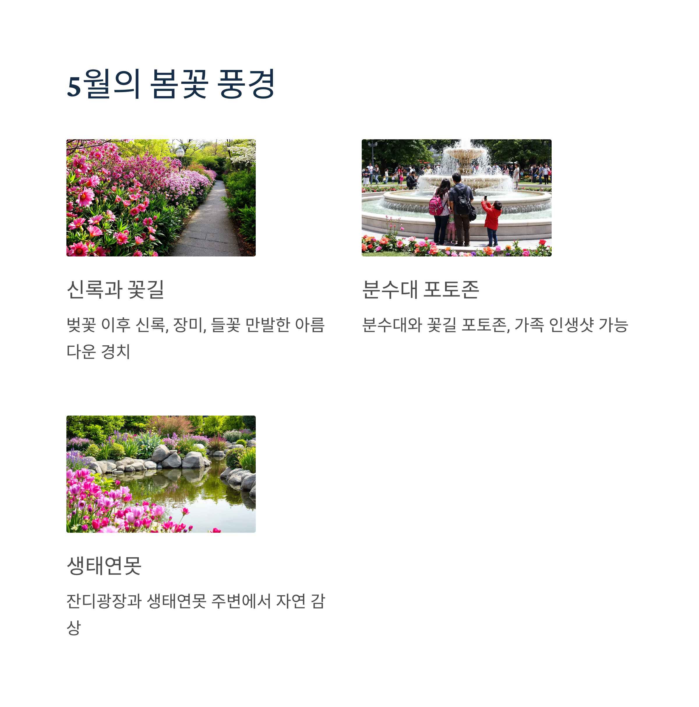 벚꽃은 4월 중순이 절정이지만, 5월에도 다양한 봄꽃이 공원을 수놓습니다.