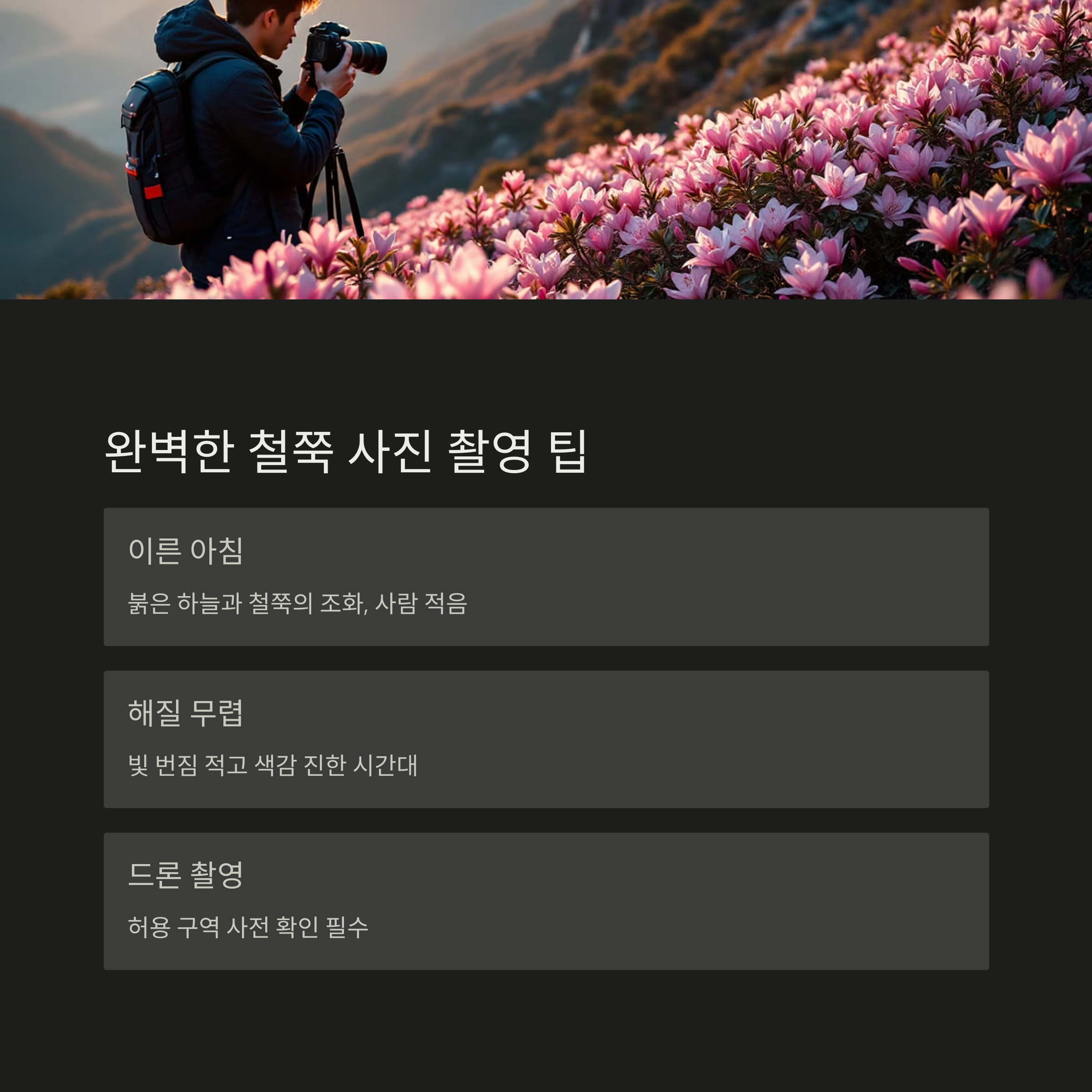 철쭉을 가장 예쁘게 담기 위한 시간대는 이른 아침 또는 해질 무렵입니다.