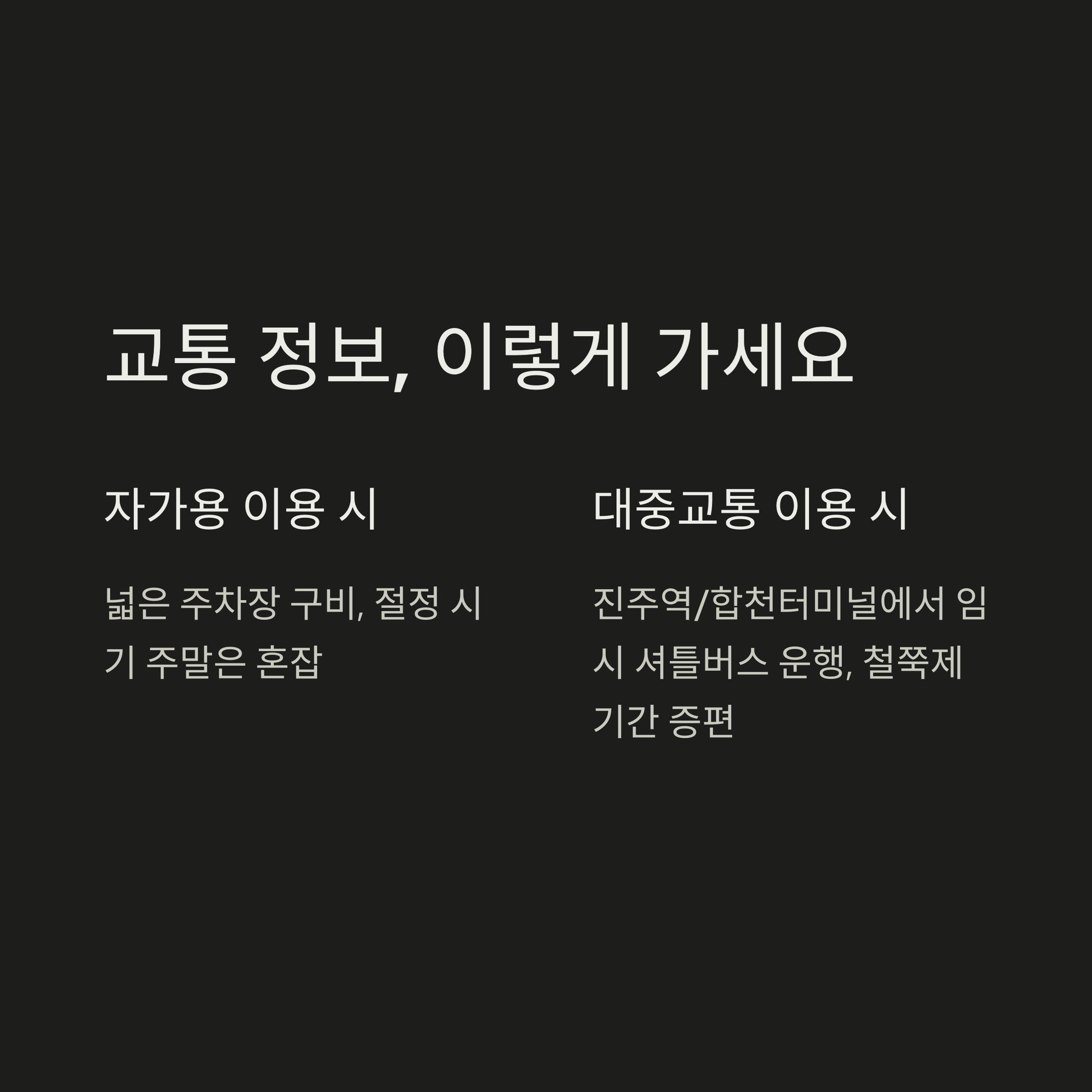 대중교통을 이용할 경우, 진주역이나 합천버스터미널에서 임시 셔틀버스가 운영되며